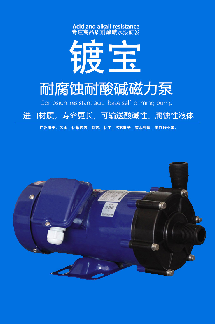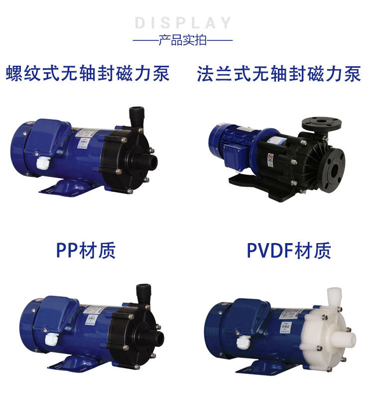MD系列磁力泵結構小巧,防漏, 在各個行業廣泛應用,以其耐腐蝕性和耐用性而擁有廣大用戶的贊譽。主要材質使用FRPP、PVDF ETFE ,可以用來輸送多種腐蝕性的液體。MD系列因其結構小巧,非常適用于過濾、噴淋、清洗、蝕刻等各種表面處理相關工藝。